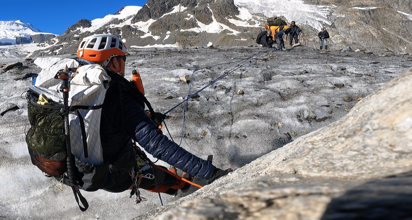In touwgroepen van 3 personen wordt met eigen alpiene uitrusting een gesimuleerde gletsjertocht en een rotsbeklimming uitgevoerd.